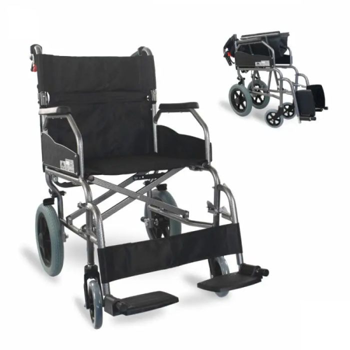 Esta silla de ruedas, cuenta con una palanca de plegado. Se utiliza como mecanismo de plegado a medias, si se presiona, el respaldo puede ser plegado y así ahorrar espacio a la hora de transportar esta silla. Este producto dispone de un juego de ruedas maciza. Gracias a esta característica, las ruedas de tu nueva silla de ruedas económica Museo no se pincharán y serán muy duraderas.