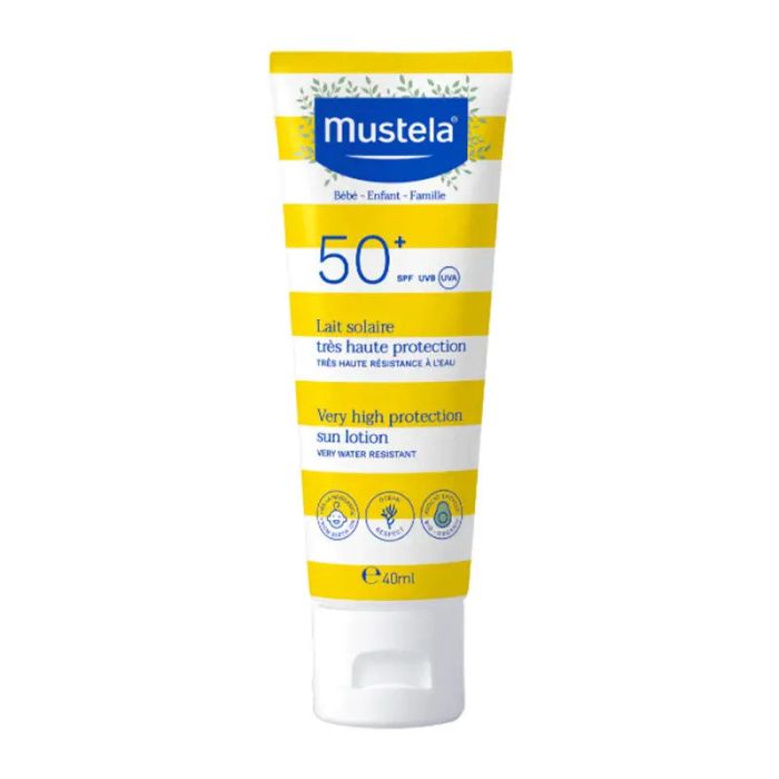 La Leche Solar con Muy Alta Protección SPF50+ de Mustela es una solución cremosa con eficacia probada, que inhibe el maltrato producido por la radiación solar sobre la delicada piel del rostro del bebé.
