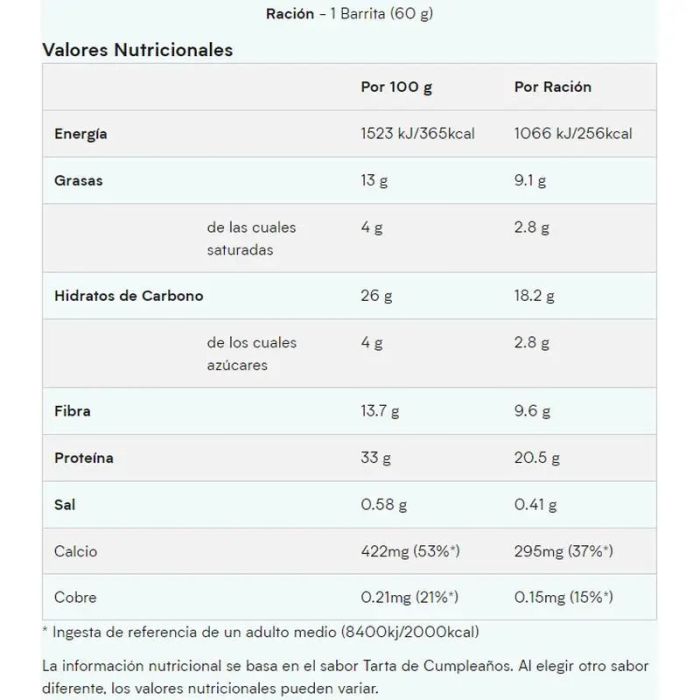 ¿Qué es la barrita proteica Layered? Nuestra barrita proteica Layered incluye seis irresistibles capas de sabor y textura que aportan una dosis de proteínas, hidratos de carbono y fibra en una riquísima y práctica barrita. Con más de 20 g de proteína, este delicioso capricho es la forma ideal de hacer que tus tentempiés se vuelvan más saludables y refuercen tus ambiciones de fitness. Principales Ventajas Deliciosas capas de proteína 21g de proteína Baja en azúcar Alta en fibra ¿Por Qué Elegirlo? Alto en fibra envuelto con 21g de proteína, son tu aliado perfecto para ayudarte a alcanzar tus objetivos diarios necesarios para el crecimiento y mantenimiento muscular. Disfruta de las barritas de caramelo blando y de crujientes de proteína, envueltas con una capa de leche o chocolate blanco - Cada barrita esta rellena de sabores irresistibles Sabores disponibles: Chocolate Sundae, Tarta de Cumpleaños, Merengue de Limón, y Cookies & Cream. La manera más deliciosa de seguir con tus entrenamientos. 1. La proteína contribuye al crecimiento y mantenimiento del músculo.