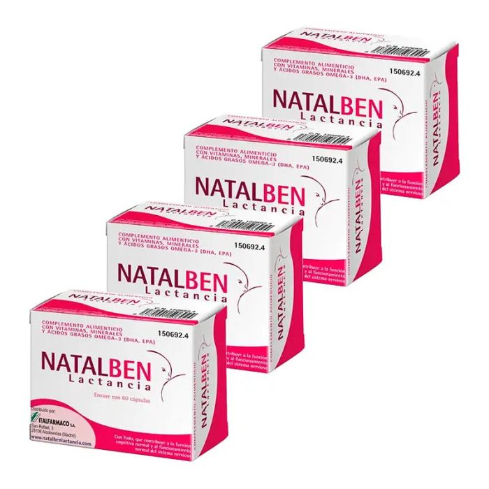 Los ingredientes de Natalben Lactancia son los siguientes: Carbonato de calcio, aceite de pescado (DHA/EPA Omega 3), agente de recubrimiento (gelatina), agente de carga (aceite de linaza refinado), ácido L-ascórbico, humectante (glicerina E-422), fumarato ferroso, humectante (sorbitol E-420), taurina, acetato de DL-alfa tocoferilo, emulgente (lecitina de girasol E-322), nicotinamida, óxido de zinc, aceites vegetales, D-pantotenato cálcico, emulgente (cera amarilla de abejas E-901), palmitato de retinilo, cianocobalamina, sulfato cúprico, colorante (óxido de hierro rojo E-172), clorhidrato de piridoxina, riboflavina, mononitrato de tiamina, colorante (óxido de hierro negro E-172), yodato de potasio, ácido pteroilmonoglutámico, colecalciferol, D-biotina y selenito de sodio.
