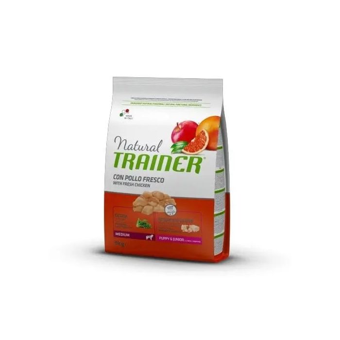Natural Trainer Adul Medium es un pienso para perros de talla media que cuenta con el sistema Novafoods Protein para preservar el valor nutritivo de la carne, mejorando su digestión y la asimilación de los aminoácidos esenciales. El perro de tamaño medio es un animal equilibrado capaz de adaptarse a condiciones de vida muy diversas. La elección de una alimentación de tipo funcional permite mejorar el estado de salud de tu mascota a nivel general. La nueva fórmula de Natural Trainer para perros medianos incorpora un porcentaje mayor de carne fresca y limita los cereales. Entre los ingredientes principales de esta receta de Natural Trainer se dan cita el extracto de manzana, fundamental para prevenir la formación de la placa dental y de la caries. Sin colorantes, conservantes ni saborizantes artificiales añadidos. En el desarrollo del sistema inmunitario juega un papel protagonista el nucleósido extracto de levadura. Natural Trainer Medium Chicken integra, además, los prebióticos y la fibra vegetal, los cuales velan por el correcto funcionamiento del aparato digestivo. Además, el alga espirulina es la encargada de resaltar el color del manto. VENTAJAS: Pienso para perros de talla media. El aloe vera aporta una acción regeneradora. Mejor asimilación de los aminoácidos esenciales y mejor digestión gracias a su sistema Novafoods Protein. Previene la formación de la placa dental y de la caries. Desarrollo del sistema inmunitario. Buen funcionamiento del aparato digestivo. Resalta el color del manto. Protege los cartílagos y las articulaciones de tu mascota. Sin colorantes, conservantes ni saborizantes artificiales añadidos. USO Y ESPECIFICACIONES: Diseñado para perros adultos de talla mediana.Con el sistema Novafoods Protein de Natural Trainer Adult Medium Chicken tu mascota mejorará su digestión y la asimilación de los aminoácidos esenciales.