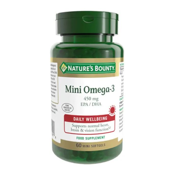 Nature's Bounty Mini Omega-3 450 Mg - 60 Cápsulas de Gelatina Blanda es un producto con una fórmula a base de aceite de pescado concentrado y purificado que proporciona los ácidos grasos esenciales EPA y DHA. Estos ingredientes aportan beneficios para el cuidado de la visión, el cerebro y el corazón.