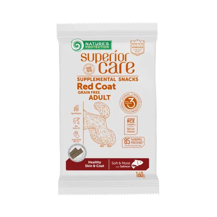 NATURE'S PROTECTION SUPERIOR CARE RED COAT HEALTHY SKIN & COAT SUPLEMENTO ALIMENTARIO SIN CEREALES-DELICITUD CON SALMÓNPara perros adultosSuplemento alimenticio sin granos delicias de salmón, diseñado para mantener el pelaje teñido de rojo para perros adultos, una piel y un pelaje saludables.Las delicias se basan en una fórmula excepcional, basada en estudios, por lo que pueden ayudar a proteger y resaltar el pigmento del pelaje rojo y la piel y el pelaje de las mascotas.BeneficiosEstos snacks se preparan sin ingredientes de origen cerealista, que suelen provocar alergias en los animales.El aceite de salmón estimula la producción de colágeno, fortalece la inmunidad y mantiene la piel y el pelaje sanos.El zinc es especialmente importante para el sistema inmunológico, ayuda a las células a regenerarse y mantiene una actividad hormonal adecuada.