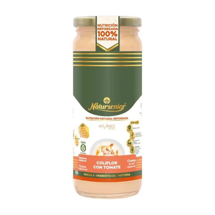 La crema Natursenior® Advance Menú Crema de Coliflor y Tomate es una receta natural reforzada que equivale a un plato completo de comida o cena. Tiene una textura adaptada de fácil deglución y está reforzado con Omega 3, Fibra Prebiótica y Proteína, ingredientes esenciales para nutrición de nuestros mayores.