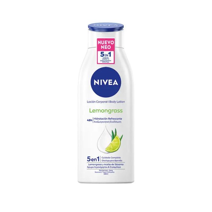 NIVEA Loción Corporal Lemongrass enriquecida con Sérum de Hidratación Profunda, Aceite de Sésamo y refrescante aroma a Lemongrass aporta a tu piel un Cuidado Completo 5en1. Sus aceites nutritivos, logran ligar y retener el agua en la piel, evitando así que la hidratación pueda evaporarse fácilmente. La piel queda bien protegida de la deshidratación, ya que se reduce la pérdida de agua y aumenta el nivel de hidratación de la piel. Los métodos de test más recientes han demostrado que esta perfecta combinación de ingredientes de alta calidad presentes tanto en el body milk nutritivo como en las demás lociones de NIVEA que incluyen el Sérum de Hidratación Profunda, logran penetrar profundamente en la piel, reteniendo el agua en su interior y proporcionando una hidratación profunda durante 48 horas.