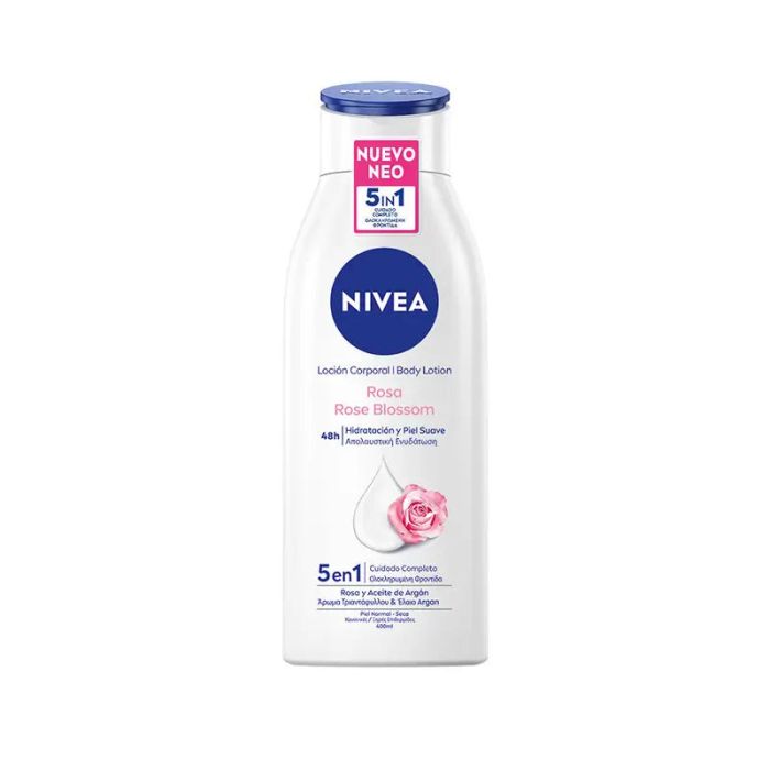 NIVEA Loción Corporal Rosa enriquecida con Sérum de Hidratación Profunda, Aceite de Argán y aroma a Rosa aporta a tu piel un Cuidado Completo 5en1. Sus aceites nutritivos, logran ligar y retener el agua en la piel, evitando así que la hidratación pueda evaporarse fácilmente. La piel queda bien protegida de la deshidratación, ya que se reduce la pérdida de agua y aumenta el nivel de hidratación de la piel. Los métodos de test más recientes han demostrado que esta perfecta combinación de ingredientes de alta calidad presentes tanto en el body milk nutritivo como en las demás lociones de NIVEA que incluyen el Sérum de Hidratación Profunda, logran penetrar profundamente en la piel, reteniendo el agua en su interior y proporcionando una hidratación profunda durante 48 horas.