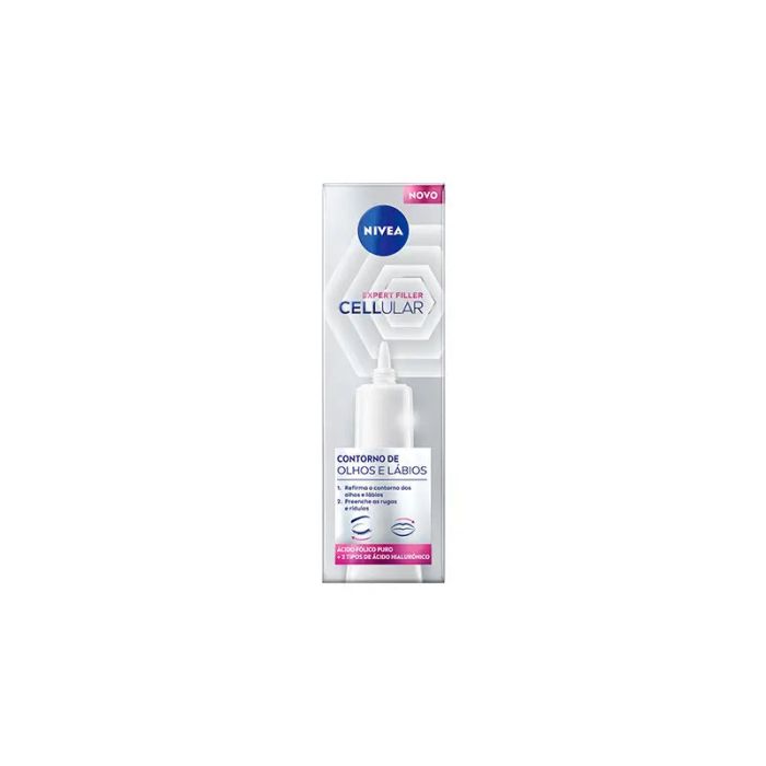 NIVEA Cellular Expert Filler Contorno de Ojos y labios está enriquecido con Ácido Fólico puro y dos tipos de Ácido Hialurónico, poderosos activos antiedad que aportan un efecto rellenador en 24 horas*. Reafirma el contorno de ojos y labios y rellena las arrugas y líneas de expresión. El Ácido Fólico puro aporta nueva vida a las células de la piel y ayuda a reparar sus fibras*, promoviendo una piel más firme y rellena. Contiene Micro y Macro Ácido Hialurónico, dos ingredientes antiedad conocidos por rellenar las arrugas eficazmente, alisar la piel e hidratar intensamente. Al instante, la piel se siente tonificada. En 1 semana, la zona de los ojos y labios se siente más firme, reduciéndose las arrugas y patas de gallo visiblemente. En 4 semanas, el contorno de ojos se redensifica y rejuvenece. *Testado en células de la piel