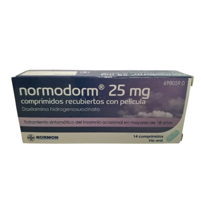 Cada comprimido Normodorm está compuesto por 25 mg de doxilamina hidrogenosuccinato como principio activo principal. El resto de excipientes son: celulosa microcristalina, hidrógeno fosfato de calcio dihidrato, hidroxipropilcelulosa de baja sustitución, sílice coloidal y estearato de magnesio, hipromelosa, dióxido de titanio (E-171), macrogol 6000, talco y laca indigotina (E-132).