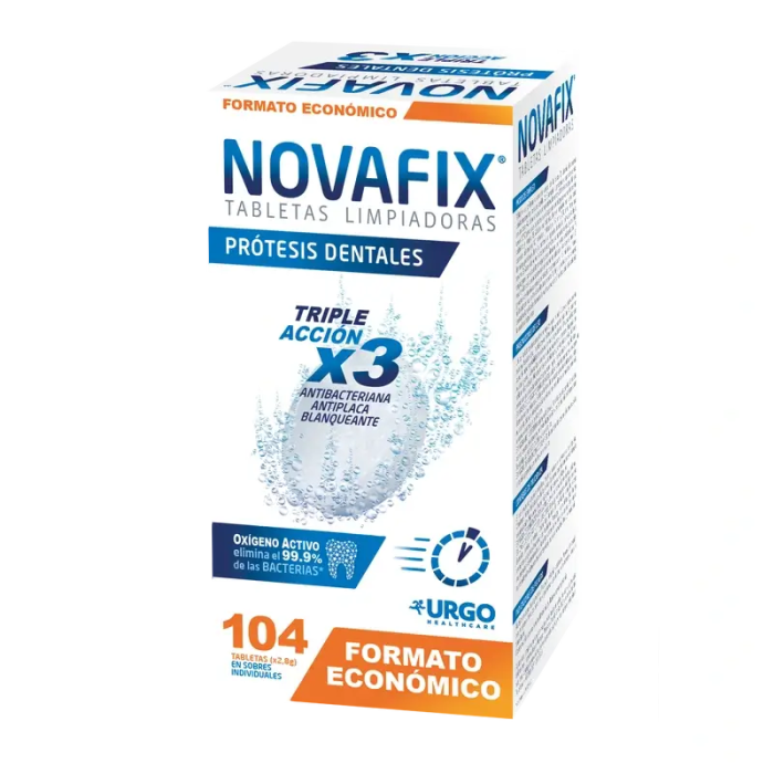 La fórmula 3-en-1 de la tabletas limpiadoras antibacterianas Novafix® libera oxígeno activo que previene la formación de sarro, elimina las manchas y la placa dental, y proporciona una agradable sensación refrescante en la boca. Su uso diario permite conservar la dentadura con todo su brillo y color natural. Para una rápida limpieza de las prótesis dentales y aparatos de ortodoncia.- Acción 3-en-1: ANTIBACTERIANA, ANTIPLACA y REFRESCANTE.- Garantiza una prótesis LIBRE DE IMPUREZAS Y RESIDUOS.- Permite mantener su prótesis en PERFECTAS CONDICIONES.- Caja con 104 tabletas: tamaño AHORRO.