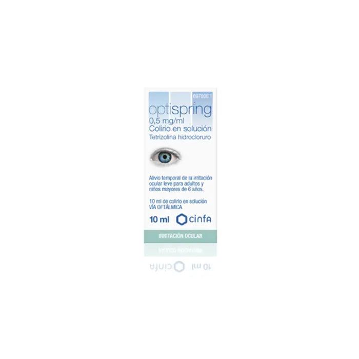 El principio activo de Optispring es la tetrizolina. Cada ml de colirio contiene 0,5 mg de tetrizolina hidrocloruro. El resto de excipientes: ácido bórico (E-284), borato de sodio, cloruro de sodio, edetato disódico, cloruro de benzalconio y agua purificada.