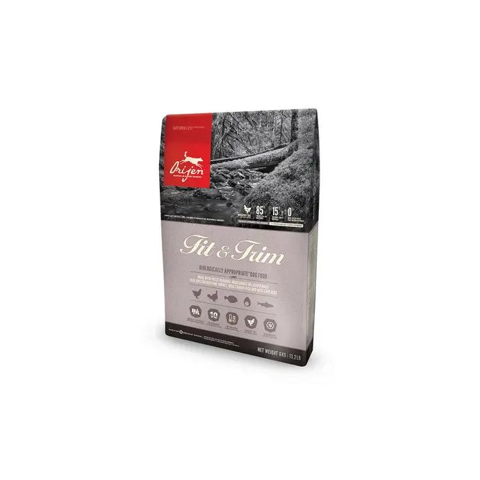 Pienso natural sin gluten Orijen Fit & Trim para perros con sobrepeso Orijen Fit & Trim pienso natural para perros es un alimento completo y equilibrado que ofrece a tu mascota todo lo que necesita de acuerdo a su evolución. Es un pienso biológicamente apropiado que nutre a los perros teniendo en cuenta su necesidad biológica. Los ingredientes que utiliza Orijen son frescos y regionales, provenientes de los animales de personas de confianza que los crían en libertad. El pienso Orijen Fit & Trim ha sido formulado para perros con sobrepeso que necesitan una cantidad limitada de calorías para favorecer un físico saludable; su limitación en grasas y carbohidratos hacen que el animal mantenga un peso adecuado, evitando la obesidad y la diabetes. Su receta contiene un 85% de carne de ave, pescado y huevos enteros para ofrecer una dieta rica en proteínas de calidad que le proporcione toda la energía que necesita cada día. Además, incluye una combinación única de fibra que proviene de frutas y verduras como las manzanas, los calabacines y las calabazas. Dentro del 85% de carne, pescado y huevos, incluye la carne de pollo, de pavo, arenque, platija, caballa, merluza y sardina. Otras legumbres y verduras que utiliza en la receta son las lentejas, los guisantes, los garbanzos las zanahorias y las espinacas; además de chirivías, peras, remolacha, alga kelp, arándanos y bayas. 2/3 de la carne que utiliza Orijen es fresca o cruda, para proporcionar los nutrientes más esenciales, y 1/3 es deshidratada. Además incorpora órganos y cartílagos, como el corazón y el hígado de pollo y pavo fresco, para eliminar la necesidad de añadir ingredientes sintéticos. Las carnes, pescados y huevos provienen de aves criadas en libertad, pescado salvaje y gallinas de corral. VENTAJAS DE ORIJEN FIT & TRIM: Pienso natural completo y equilibrado para perros. 85% de carne de ave, pescados y huevos enteros frescos de animales en libertad. 2/3 de carne fresca o cruda. Limitado en grasas y calorías para perros con sobrepeso. Combinación única de legumbres, frutas y verduras que aportan fibra. USO Y ESPECIFICACIONES: Pienso natural Orijen con carne de aves, pescados y huevos frescos adecuado para perros adultos de cualquier tamaño o raza. Alimentación limitada en calorías y grasas adecuada para perros con sobrepeso.Con Orijen Fit & Trim pienso natural para perros cuidas la salud de tu mascota ofreciendo ingredientes frescos y de primera calidad.