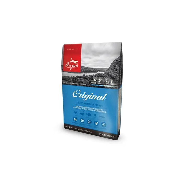 Pienso para perros Orijen Original Canine El pienso Orijen Original está diseñado para satisfacer las necesidades alimenticias y nutricionales de perros adultos. Como carnívoros evolucionados, los perros necesitan consumir una buena cantidad de carne animal y este alimento ha logrado mezclar esto con los mejores ingredientes naturales para ofrecer uno de los mejores y más completos alimentos que puedes encontrar en el mercado. Esta firma de origen canadiense utiliza la carne como materia prima principal para fabricar sus productos, por lo que esta es la principal fuente energética del alimento, sin granos de cereales, comunes en otros piensos para perros, seleccionando los ingredientes cuidadosamente según el aparato digestivo de cada perro para adaptarlo a sus necesidades. Por ello, el pienso Orijen Original para perros adultos reúne los mejores productos procedentes de Canadá, los lagos del Norte y el océano Pacífico, cocinados a bajas temperaturas (90º) para conservar todo su valor nutricional. Para mejorar su calidad, añade hierbas que favorecen la digestión y facilitan la absorción de nutrientes esenciales para el mantenimiento de sus músculos y articulaciones a lo largo de su vida. VENTAJAS DE PIENSO ORIJEN ORIGINAL PARA PERROS : Alimento orgánico para perros adultos. Hasta un 85% de ingredientes de origen animal de primera calidad. Bajo en carbohidratos. Beneficia la buena digestión. USO Y ESPECIFICACIONES: Pienso preparado con ingredientes naturales de origen orgánico y un 85% de ingredientes animales para la alimentación de perros adultos de cualquier raza, tamaño o peso. Alimenta a tu perro con el pienso Orijen Original Adulto para que tenga una dieta equilibrada con un alimento de la mejor calidad.