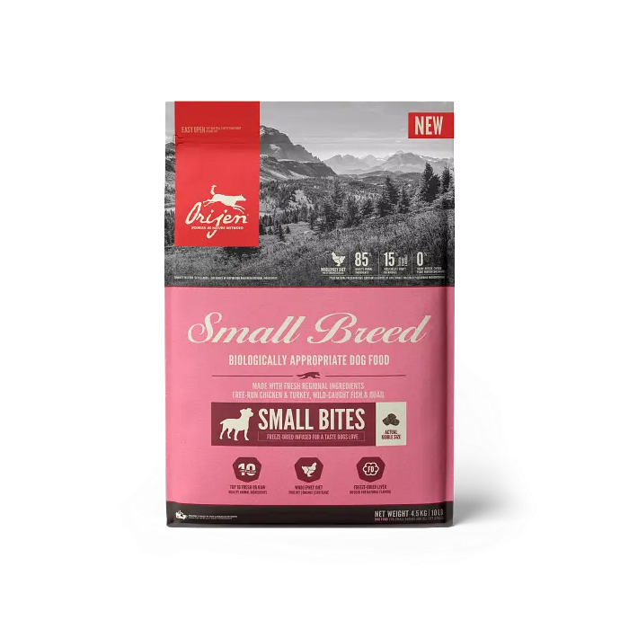 Pienso natural para perros de raza pequeña OrijenUna fórmula adaptada a las necesidades nutricionales de los perros de raza pequeña, que cubre su nivel de energía y satisface su estilo de vida activo. Esta receta tiene un alto contenido de proteínas y está elaborada sin cereales, favoreciendo así el mantenimiento de la masa muscular y una óptima digestión.El pienso Orijen Small Breed es un alimento biológicamente apropiado hecho con ingredientes frescos regionales y carne cruda de presa, rica en nutrientes y proteínas. La fórmula incorpora un 85% de productos de origen animal como el pavo y el pollo de corral, la codorniz, el pescado de captura salvaje y los huevos. El 15% restante lo ocupan legumbres, frutas, verduras y plantas. Entre los vegetales de la receta encontrarás las lentejas, los garbanzos, las manzanas, las peras, los arándanos, las zanahorias, las espinacas y la raíz de cúrcuma. Como ves, un menú muy completo y balanceado para ofrecer a tu perro lo mejor, y consiguiendo a la vez un gran sabor al que no se podrá resistir.Este alimento proporciona la nutrición óptima para tu perro de raza pequeña, con unos niveles de energía adaptados que le ayudan a mantener un peso saludable. Además, está especialmente formulado para fortalecer su sistema inmunológico y sus articulaciones. Y esto lo consigue aportando un alto nivel de vitaminas y minerales y añadiendo condroprotectores como la glucosamina y la condroitina. El pienso también es rico en omega 3 y omega 6, por lo que observarás que el pelaje de tu mascota está suave y brillante, y su piel sana.VENTAJAS DEL PIENSO ORIJEN SMALL BREED:Alimento natural para perros de raza pequeña.Adaptado a sus necesidades.Rico en proteínas.Sin cereales.Con un 85% de ingredientes animales.Carne fresca y cruda de origen regional.Combinación de frutas, verduras y plantas saludables.Rico en nutrientes, vitaminas y minerales.Favorece una buena digestión.Con ácidos grasos esenciales para el cuidado del pelo y la piel.Con glucosamina y condroitina para la salud articular. USO Y ESPECIFICACIONES:Pienso completo y equilibrado recomendado para satisfacer las necesidades nutricionales y energéticas de los perros de raza pequeña.