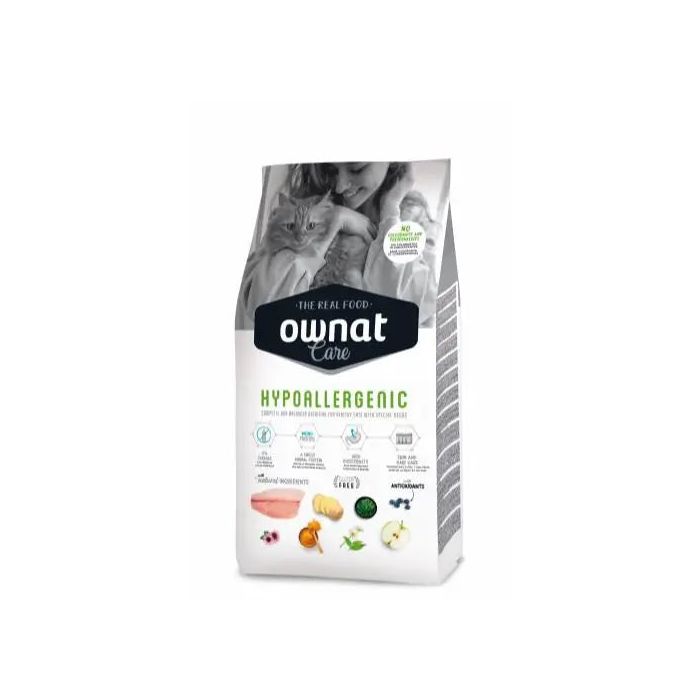 HYPOALLERGENIC Gluten freeOWNAT CARE HYPOALLERGENIC es un alimento de alta gama especialmente elaborado con pescado como única fuente de proteína animal y libre de cereales. Supone una alternativa excelente para discriminar alergias e intolerancias. Además, el pescado incorpora unos niveles óptimos de ácidos grasos esenciales muy importantes para poder mantener una piel sana y un pelo sedoso y brillante.0% CEREALESFórmula libre de cereales, lo cual evita las intolerancias o alergias que en determinadas ocasiones podrían provocar.MONOPROTEIC - UNA SOLA PROTEINA ANIMALSu única fuente de proteína animal permite seleccionar por exclusión, la fuente de proteína más adecuada para aquellos gatos con problemas de alergias e intolerancias.ALTA DIGESTIBILIDADSu exclusivo contenido en pescado como única fuente de proteïna animal y su formulación libre de cereals promueven la alta digestibilidad.CUIDADO DE LA PIEL Y DEL PELOSus altos niveles de omega-3 ayudan a mantener una piel sana y un pelo sedoso y brillante.