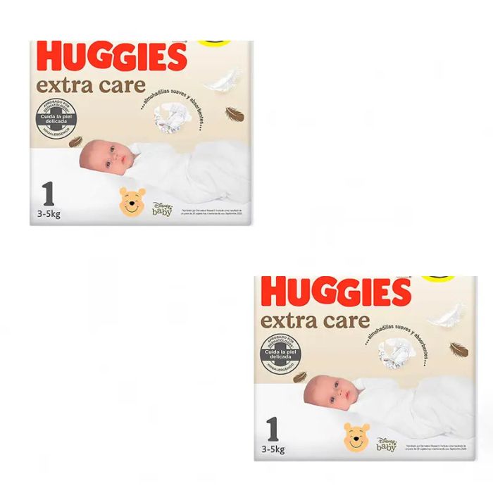 Pack 2 x Huggies Extra Care Pañal para Bebé Recién Nacido Talla 1 (3-5KG), 56Unidades
