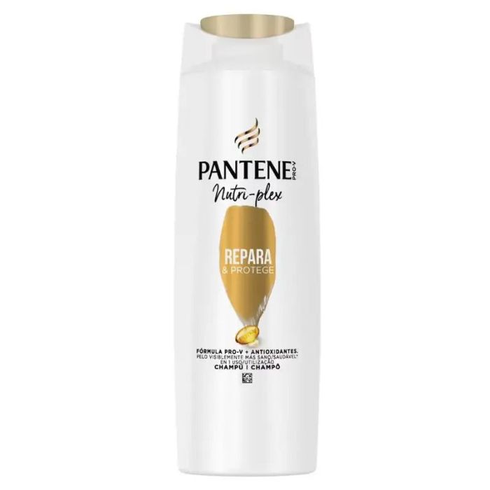 CHAMPÚ PANTENE REPARA Y PROTEGE CON FÓRMULA PRO-V QUE COMBINA NUTRIENTES. Limpia suavemente, a la vez que alimenta el cabello con los nutrientes Pro-V activos para fortalecerlo* desde dentro hacia fuera. Revierte instantáneamente los signos del cabello débil y dañado como la falta de suavidad y brillo. Este champú Pantene Repara & Protege ayuda a: • Recuperar la fuerza del cabello contra los daños causados por el peinado. • Prevenir la formación de puntas abiertas. • Aportar brillo y suavidad al cabello. * fuerza contra los daños provocados por el peinado