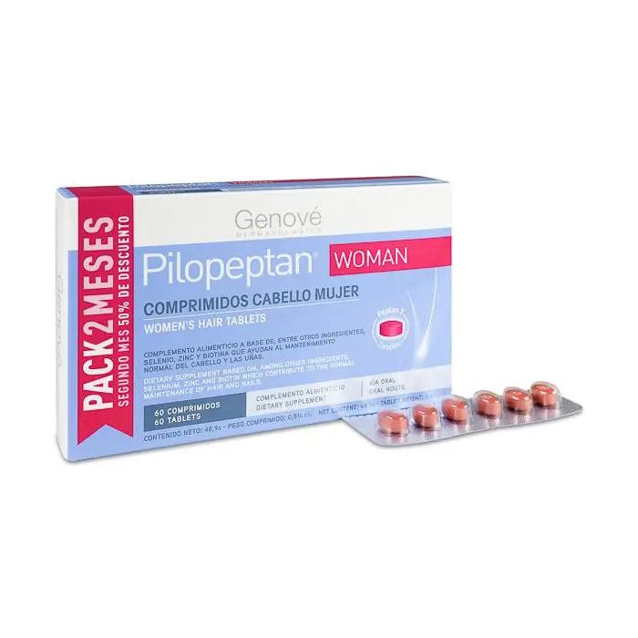 Pilopeptan Woman Comprimidos estimula la fase anágena de crecimiento del cabello, induce la formación de queratina, promueve la regeneración capilar y protege y equilibra el cuero cabelludo. El tratamiento combinado de Pilopeptan Intensive más Pilopeptan Woman Comprimidos consigue aumentar la densidad capilar, el brillo y mejorar el aspecto del cabello además de contribuir a la buena salud de las uñas. El Selenio, el Zinc y la Biotina (Vitamina B7) ayudan al mantenimiento normal del cabello y las uñas. Contiene, además, Ácido fólico y Hierro, nutrientes carentes en ciertos momentos de la vida de la mujer, que pueden causar alopecia. Contiene un hierro micronizado y microencapsulado de fácil asimilación con estudios que garantizan su alta tolerancia. Sin gluten. Sin azucares. Sin lactosa. Apto en períodos de embarazo y lactancia.