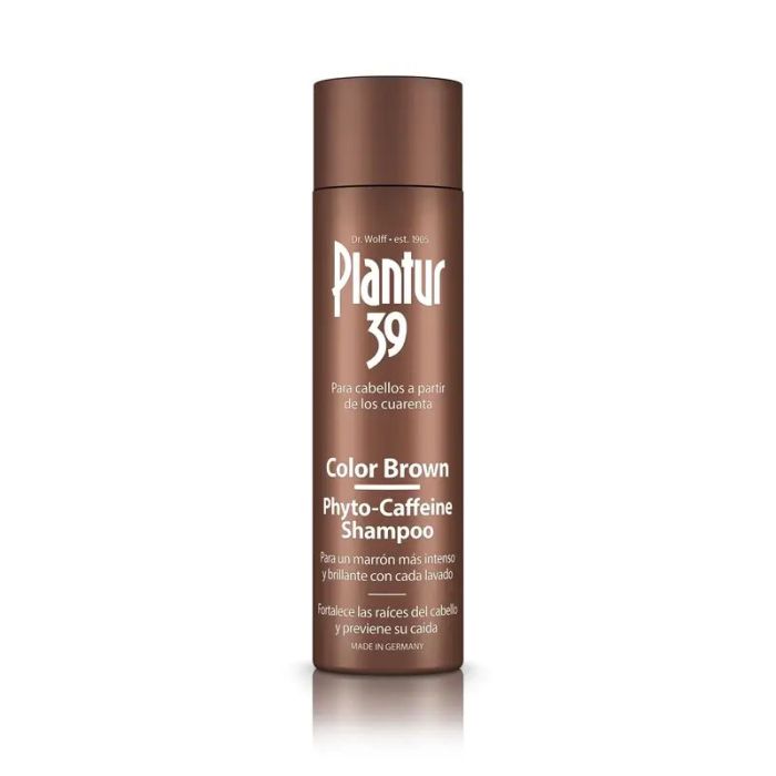 Champú Plantur Brown, diseñado para cabello castaño. Proporciona tonos marrones naturales, intensificando el color con cada uso. Fórmula suave que fortalece el cabello, ideal para uso diario en cabellos teñidos o naturales. Tamaño de 250 ml.