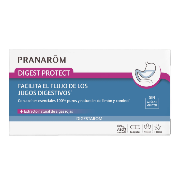 APOYA LA DIGESTIÓN DESPUÉS DE LAS COMIDAS: DIGEST PROTECT es una innovación de los laboratorios Pranarôm, diseñada para apoyar el flujo de los jugos digestivos y ofrecer un mayor confort digestivo, especialmente después de las comidas. PRINCIPIOS ACTIVOS NATURALES Y EFICACES: Combinando raíz de malvavisco, litotamnio en polvo y aceites esenciales BIO, esta solución ayuda a optimizar el conjunto de la digestión y a restablecer el equilibrio digestivo. COMPOSICIÓN SEGURA: DIGEST PROTECT es un complemento alimenticio a base de ingredientes totalmente naturales, sin gluten, azúcares, edulcorantes ni otros ingredientes controvertidos. ACEITES ESENCIALES 100% PUROS, NATURALES E INTEGRALES: Los aceites esenciales quimiotipados de comino, limón, hierba limón, jengibre y menta piperita, todos de cultivo ecológico, actúan en sinergia con el polvo de litotamnio y el extracto de raíz de malvavisco para mejorar el bienestar digestivo. GAMA DIGESTAROM: Forma parte de DIGESTAROM, la gama pionera en digestión natural con Aceites Esenciales 100% puros y ecológicos. PRANARÔM, LA CIENCIA DE LOS ACEITES ESENCIALES: El laboratorio Pranarôm, experto en Aceites Esenciales, propone soluciones innovadoras y naturales a base de Aceites Esenciales quimiotipados 100% puros, integrales y biológicos.