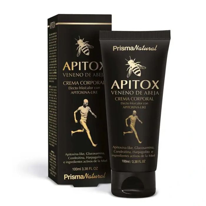 APITOX CREAM 100ml, crema de uso tópico corporal de la marca Prisma Natural con textura refrescante y rápida absorción que aporta sensación de relajación, bienestar y confort corporal inmediato en la piel. Efecto frío /calor, con apitoxina-like de textura refrescante y rápida absorción, la alternativa sostenible al veneno de abeja procedente de la biotecnología y con extracto natural de capsaicina, que estimulan la circulación sanguínea cutánea. Enriquecida con extracto de miel, con beneficios purificantes, hidratantes y antioxidantes; mentol, con acción refrescante; además de extracto de harpagofito, condroitina y glucosamina.