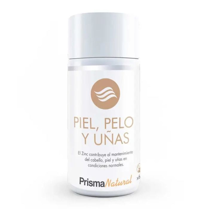 Piel, pelo y uñas 60 capsulas 563mg Prisma Natural. Complemento alimenticio a base de ingredientes naturales. El complejo incluye: Levadura de cerveza, Zinc, Vitaminas del grupo B, Vitamina E y Vitamina C más cola de caballo. El zinz contribuye al mantenimiento del cabello, piel y uñas en condiciones normales. Tomar 2 cápsulas al día.