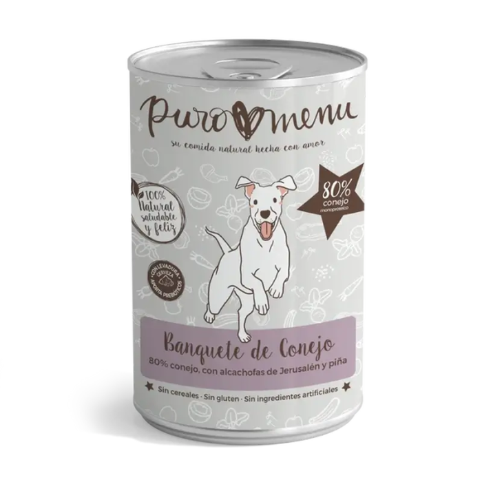 Alimento cocido premium, completo y equilibrado 80% conejo, con alcachofas de Jerusalén y piña 100% natural de verdad, 0% aditivos sintéticos, 0% cerealesMonoproteíco: con solo una fuente de proteína animal De bajo valor calóricoIngrediente principal: carne fresca de músculoCon suplementos y superalimentos naturales, para asegurar la ingesta de vitaminas y minerales esencialesFormato lata, almacenar a temperatura ambiente