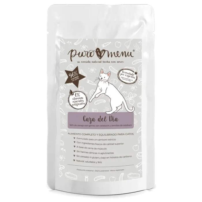 Alimento natural cocido, completo y equilibrado para gatos y gatitos de cualquier raza96% de conejo con ganso, con calabacín y semillas de calabazaFormulado por expertos para un carnívoro estricto como es el gatoIngrediente principal: carne de conejo 0% de vitaminas y minerales sintéticos, sin cereales ni gluten Enriquecido con taurina, un aminoácido esencial para los gatosFormato sobre 100g. Textura paté. Almacenar a temperatura ambiente