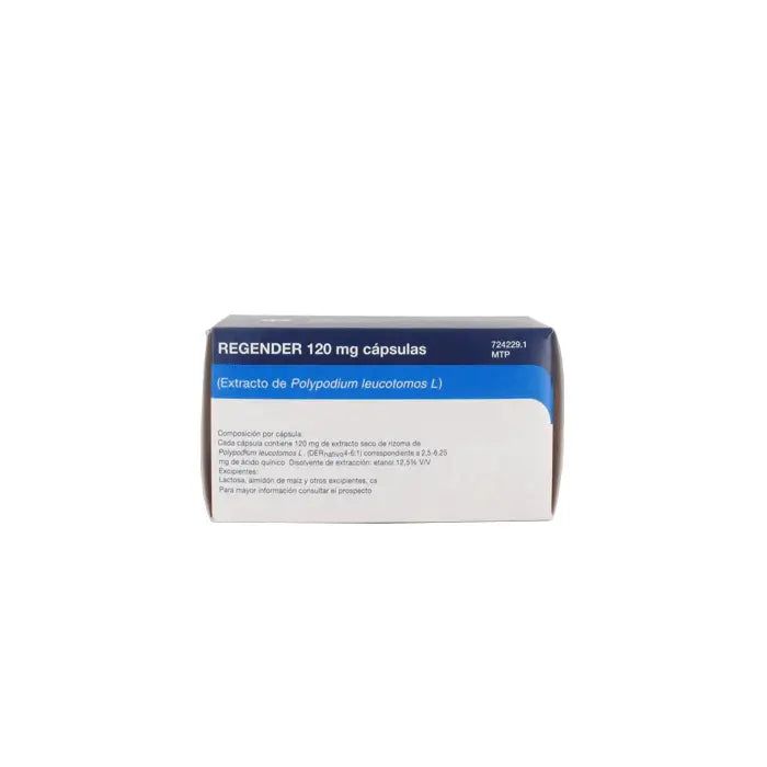 El principio activo de Regender es 120 mg de extracto seco de rizoma de Polypodium leucotomos L.Los excipientes son los siguientes:
