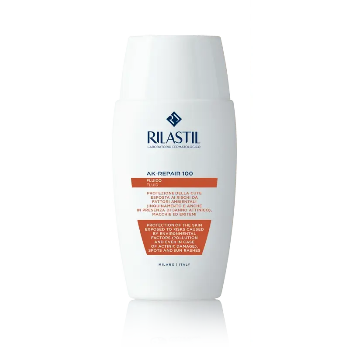 Rilastil Sun System Ak-Repair 100 es un fotoprotector solar anti-imperfecciones para pieles con brillos y tendencia acnéica. Emulsión fluida indicada en pieles propensas al eritema y a la formación de manchas. También para prevención y protección de piel expuesta a riesgos provocados por factores ambientales, queratosis actínica y cánceres de piel no melanoma.
