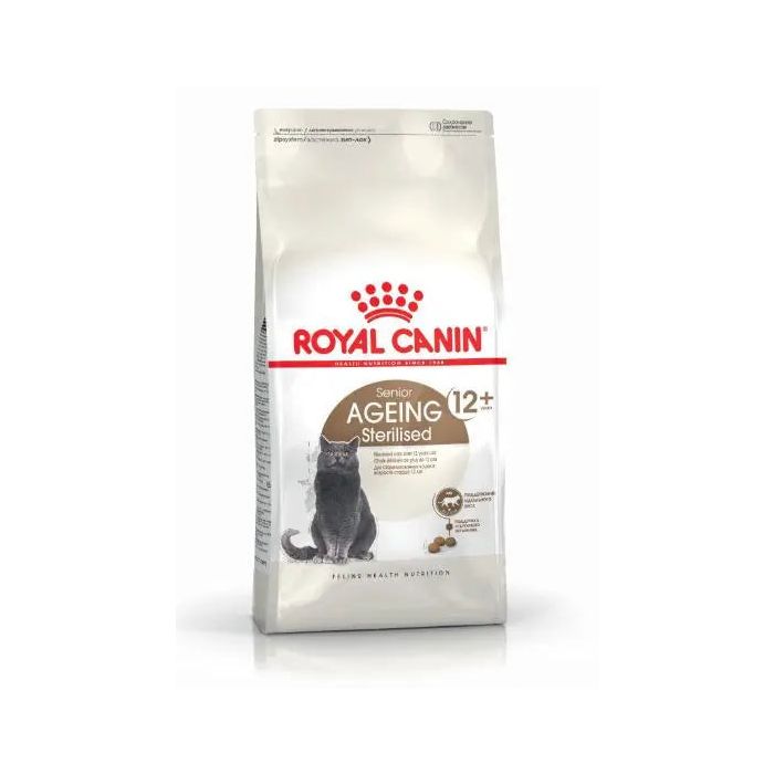 Pienso para gatos esterilizados mayores de 12 años Royal Canin Feline Sterilised 12 Royal Canin Feline Sterilised 12 está especialmente formulado para ayudar a los gatos esterilizados de más de 12 años a mantener un peso óptimo y un sistema urinario saludable. Después de la esterilización, las necesidades del gato cambian y su apetito aumenta. Los gatos esterilizados mayores de 12 años también tienen riesgo de sobrepeso. Royal Canin Feline Sterilised 12 tiene un contenido calórico estrictamente controlado, contiene menos grasas y menos carbohidratos como el almidón, que estimula la ingesta del alimento. También tiene L-carnitina (200 mg/kg) que promueve la movilización de las reservas de grasa. Sterilised 12 ofrece ayuda frente al envejecimiento gracias a un complejo de antioxidantes (vitaminas, licopeno, polifenoles de té verde y de uva) y niveles reforzados de ácidos grasos esenciales. Este pienso ayuda además a mantener la salud del sistema urinario controlando la acidez de la orina, gracias a un nivel adaptado de fósforo y mediante el control del pH en la orina (pH 6,0 hasta 6,5) y su alto contenido en proteínas fomenta el mantenimiento de la tonicidad muscular. Alimento para gatosesterilizados muy equilibrado con contenido calórico controlado. Enriquecido con L-carnitina, que favorece la movilización de las reservas de grasas. Ayuda frente al envejecimiento gracias a un complejo de antioxidantes. Especialmente formulado para ayudar a mantener un peso óptimo. Ayuda a mantener la función renal y controla la acidez de la orina.