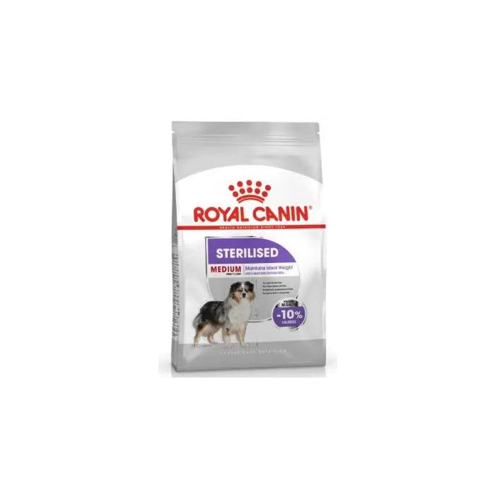 Pienso para perros medianos esterilizados con tendencia al sobrepeso Royal Canin Medium SterilisedEl pienso seco Royal Canin Medium Sterilised está indicado para la alimentación de perros de razas medianas (de 11 kg a 25 kg de peso) que estén esterilizados y tengan tendencia al aumento de peso. Su fórmula patentada consigue que se mantengan fuertes y sanos y al mismo tiempo se mantengan en un peso adecuado.Todos sus ingredientes son de fácil asimilación y muy digeribles para favorecer la calidad de sus heces y regular sus deposiciones, además de evitar el mal olor. El pienso Royal Canin Medium Sterilised está diseñado para controlar el apetito entre comidas y también para mantener una buena higiene dental.Por otro lado, es muy importante que sus articulaciones y músculos se mantengan fuertes por eso contiene una combinación de antioxidantes que le ayudan a envejecer correctamente. Y su piel y su pelo mantienen la salud con su gran fuente de vitaminas y minerales. Así, tu perro esterilizado se mantiene fuerte y ágil.
