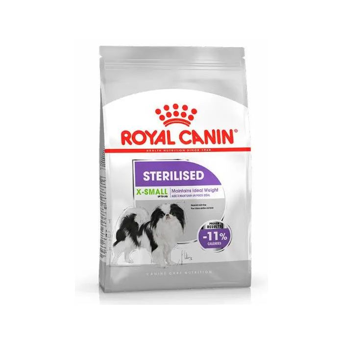 Alimento seco y completo bajo en calorías para perros pequeños esterilizadosEl pienso Royal Canin XSmall Sterilised está indicado para perros de raza mini (hasta 4 kg de peso) y a partir de los 10 meses de edad, que han sido esterilizados y tienen tendencia a coger peso. La fórmula de esta comida aporta a tu mascota gran cantidad de proteínas (26%) y un bajo contenido en grasas (14%) para que se mantengan en un buen peso después de la esterilización.La gama de piensos XSmall de Royal Canin están diseñados para aportar todas las necesidades nutricionales a perros muy pequeños. La receta XSmall Sterilised está compuesta por una serie de fibras que ayudan a que se sientan saciados y no coman entre horas. También está enriquecida con L-carnitina y elaborada con pocas calorías para que mantengan un peso adecuado, ya que tras la esterilización aumenta el riesgo de obesidad en los perros.Por otro lado, esta comida para perros esterilizados cuida de la salud urinaria de tu mascota. Los componentes de este pienso ayudan a reducir los problemas urinarios que los perros de raza mini suelen sufrir. Royal Canin selecciona los mejores ingredientes elegidos específicamente para el cuidado de la salud y el bienestar de los perros, para favorecer un crecimiento y un desarrollo óptimo en cada momento. La línea Royal Canin Vet Care son productos fisiológicos diseñados para aportar los nutrientes necesarios en cada situación, como es el caso de la esterilización.