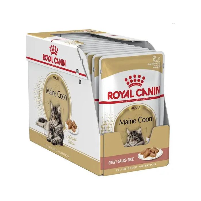 Comida húmeda para gatos Maine Coon Royal CaninRoyal canin Maine Coon húmedo para gatos es un alimento de calidad que ofrece una nutrición óptima adaptada a las necesidades de la raza. Su receta especial ofrece un alto contenido de energía muy concentrada para mantener la vitalidad de tu gato cada día. Además, también cuida sus huesos y articulaciones gracias a la fórmula adaptada.Los Maine Coon son gatos de gran tamaño con músculos fuertes y un pelaje denso y sedoso. Estas características requieren de una alimentación especial que cubra todas sus necesidades energéticas y nutricionales. Debido a su grandeza y peso, debemos vigilar la salud de sus articulaciones, que pueden verse afectadas si no se cuidan de forma adecuada. Para el mantenimiento osteoarticular, la comida húmeda Royal Canin Maine Coon incorpora condroitina y glucosamina. Además, también contiene aportes de ácidos grasos omega 3 y omega 6 para que la piel y el pelaje estén sanos.Royal Canin no sólo ofrece una comida húmeda de calidad específica para gatos de la raza Maine Coon, también tiene en cuenta su sabor y su textura. Sus trozos de carne en salsa tienen una textura adaptada irresistible y un gran sabor. ¡Tu felino estará encantado con su nuevo alimento!