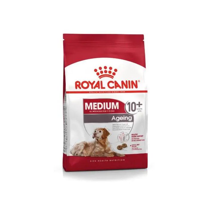Pienso para perros de razas medianas con más de 10 años Royal Canin Medium Ageing 10 Los perros adultos de razas medianas (entre 11 kg y 25 kg de peso adulto) a partir de los 10 años tienen en esta fórmula el pienso ideal. Royal Canin Medium Ageing 10 contiene una serie de nutrientes esenciales y antioxidantes para que los perros mayores tengan un envejecimiento saludable. Royal Canin Medium Ageing 10 ayuda a los perros de razas medianas que tienen un metabolismo más lento a tener la cantidad de energía necesaria para estar activo todo el día con este pienso alto en proteínas (26%), para que sus músculos estén enérgicos y tonificados, y bajo en grasa (14%) para que se mantenga en su peso ideal. Contiene un complejo patentado de antioxidantes y aminoácidos que les ayuda a envejecer adecuadamente, fortaleciendo sus defensas naturales y sintiéndose sanos durante más años. También está enriquecido condroitina y glucosamina para que sus articulaciones se mantengan en perfecto estado de salud, y el calcio y fósforo refuerzan su sistema óseo. Además, sus componentes contribuyen a la salud de su sistema urinario y evita que sufran trastornos dolorosos como los cálculos. También mejora el tracto digestivo con sus ingredientes ricos en fibra, los cuales contribuyen a una mejora en la digestión y por lo tanto a la correcta consistencia de sus heces. Por otro lado, Royal Canin también favorecer el estado de su pelaje manteniéndolo brillante con zinc, ácidos grasos omega 3 y EPA/DHA, al mismo tiempo los minerales y vitaminas crean una barrera para evitar el riesgo de sufrir enfermedades de la piel. Y gracias a la taurina mejoran la salud de su corazón ya que estimula los movimientos musculares de este órgano vital. El pienso seco Royal Canin Medium Ageing 10 está formado por pequeñas croquetas que se adaptan al tamaño de su boca, facilitando la masticación, y se rehidratan de tal manera que estimula su apetito y evita la formación de sarro y mantiene una buena higiene bucodental. Además, le aporta todos los nutrientes que necesita para estar fuerte durante toda su vida. La marca Royal Canin fue fundada en 1967 con el objetivo de ofrecer la mejor alimentación a las mascotas. Desde el respeto y la responsabilidad crean alimentos ricos en proteínas y nutrientes para que los animales crezcan con salud. Tienen en cuenta todas las condiciones para elaborar sus piensos: tamaño y raza del perro, actividad diaria, estilo de vida, edad...