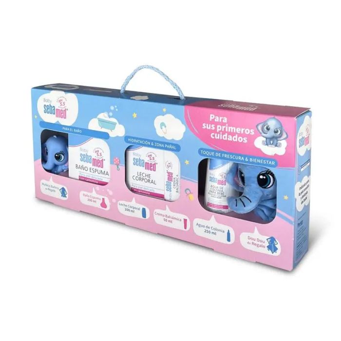 Pack de regalo de productos Baby Sebamed, con dos regalos: muñeco Sebi para la