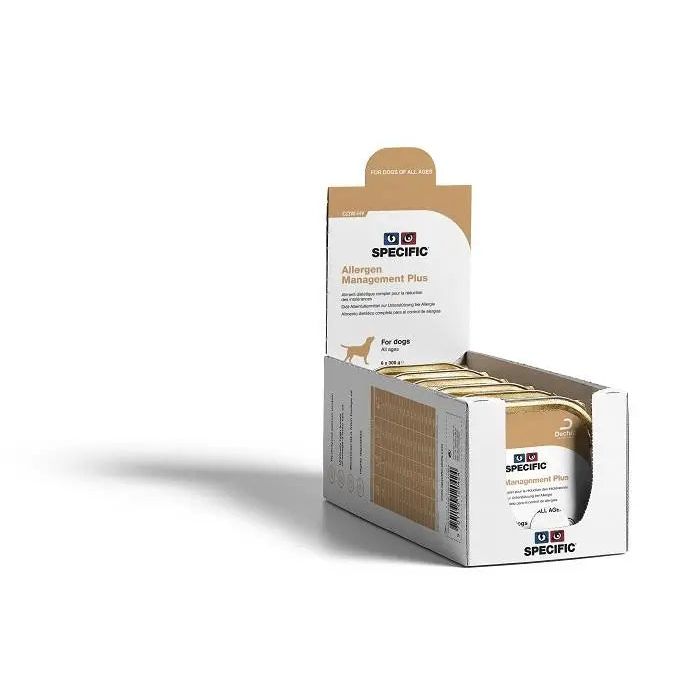 SPECIFIC ™ Allergen Management Plus es un alimento húmedo para perros con alergias múltiples, tanto relacionadas con alimentos como ambientales. Para reducir el riesgo de desencadenar alergias alimentarias, tiene un número limitado de ingredientes cuidadosamente seleccionados y proteínas hidrolizadas. Los altos niveles de aceites de pescado Omega-3 y otros nutrientes que favorecen la piel mejoran la condición de la piel aumentando la protección contra los alérgenos externos mientras que los Omega-3 favorecen el proceso antiinflamatorio natural. Para perros adultos que sufren de alergias múltiples.¿Por qué elegir Allergen Management Plus?Ofrece un apoyo superior a la piel con un nivel extremadamente alto de Omega-3 combinado con niveles incrementados de vitamina A, E y complejo B, zinc y selenio y Omega-6 del aceite de borraja, para una piel y pelaje saludables.Proteína de salmón hidrolizada y arroz: ingredientes con menor probabilidad de desencadenar reacciones alimentarias.Con ingredientes de alta digestibilidad, esta dieta también es adecuada para perros con problemas digestivos.