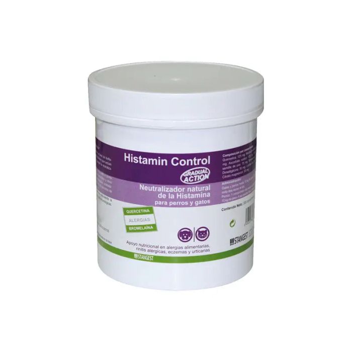 Histamín Control es un alimento complementario dietético para la reducción de la intolerancia a ingredientes y nutrientes para perros y gatos. La base de ingredientes que lo componen ayudan a obtener un buen funcionamiento del sistema inmunológico.Composición por comprimido:Fosfato dicálcico, Metilsulfonilmetano, Acacia del Japón (Sophora japonica, fuente de quercetina), Mono- y diglicérdios de ácido behénico, Beta-Glucanos (fuente de hidratos de carbono), Bromelina (fuente de proteínas), Gluconato de magnesio, Estearato de magnesio, Aceite de girasol, Ácido lipoico, cristobalita, almidón gliconato sódico, estearil fumarato sódico.Aditivos por comprimido:ANTIOXIDANTES:(1b301) Ascorbato de sodioAROMATIZANTES:(2b17034) GlicinaExtracto de ortiga (Urtica dioica L.)OLIGOELEMENTOS:(3b606) Cinc (Quelato de cinc de aminoácidos, hidratado)Componentes analíticos:Proteína bruta: 6.26 %, Grasa bruta: 5.41 %, Fibras brutas: 1.44 %, Ceniza bruta: 18.93 %.Instrucciones de uso:– Histamín Control: 1 comprimido de 1.3 g por cada 10 kg de peso, 2 veces al día. A ser posible, fuera de las comidas.– Histamín Control Razas Grandes: 1 comprimido de 3 g por cada 25 kg de peso, 2 veces al día. A ser posible, fuera de las comidas.Período de utilización recomendado: de 3 a 8 semanas. Si los signos de intolerancia desaparecen, este alimento puede utilizarse indefinidamente.Presentaciones:Histamín Control:C210100: Envase de 60 comprimidos de 1.3 gC210102: Envase de 300 comprimidos de 1.3 g en blíster210103: Envase clínico de 120 comprimidos de 1.3 g en blísterC210102: Envase clínico de 300 comprimidos de 1.3 g en blísterHistamín Control Razas Grandes:C210105: Envase de 60 comprimidos de 3 gC210106: Envase clínico de 240 comprimidos de 3 g en blíster