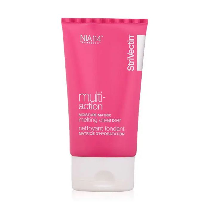 La Moisture Matrix Cleanser de StriVectin, es un fluido trifásico que limpia y desmaquilla la piel sin efecto abrasivo. Está diseñado con una super mezcla de ingredientes que benefician el cuidado del rostro, tales como: márula, aguacate, almendra dulce, semilla de uva, extracto de hoja de diente de león, extracto de arroz salvado y girasol. Este compuesto al contacto con el agua, se transforma de un refrescante gel, a una aceitosa mezcla, hasta llegar a una hidratante leche purificadora.