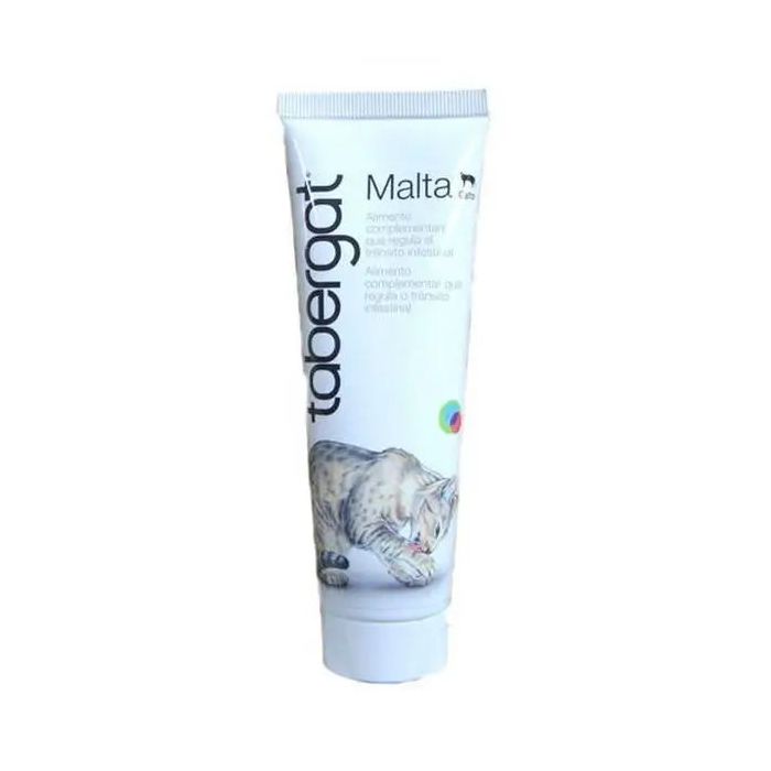 Pasta de malta para gatos Este producto es un suplemento alimentario. Es una pasta muy apetitosa para los gatos creada a base de productos naturales con propiedades laxantes, con el que se consigue regular su tránsito intestinal, además de complementar su dieta. Contribuye también a evitar la formación de bolas de pelo y se recomienda también para casos de extreñimiento. Esta malta esta preparada con subproductos de origen vegetal, con un mínimo de un 50% de malta, contiene también grasas, aceites y azúcares. Se debe administrar 1 o 2 pulsaciones por día para facilitar que nuestro gato ingiera el producto por su propia voluntad. Normalmente se le pone la dosis en el hocico o la pata. VENTAJAS DE LA MALTA TABERGAT: Previene y evita la formación de las bolas de pelo. Sabor apetitoso para los gatos. Ayuda a regular el tránsito intestinal. Enriquece la dieta diaria. Fácil de dar. USO Y ESPECIFICACIONES: Malta para gatos adecuada para enriquecer su dieta y evitar las bolas de pelo. Composición: 50% de malta, grasas, aceites y azúcares Dosificacion: 1 o 2 pulsaciones por día. Normalmente se le pone la dosis en el hocico o la pata. Formato: 100 g