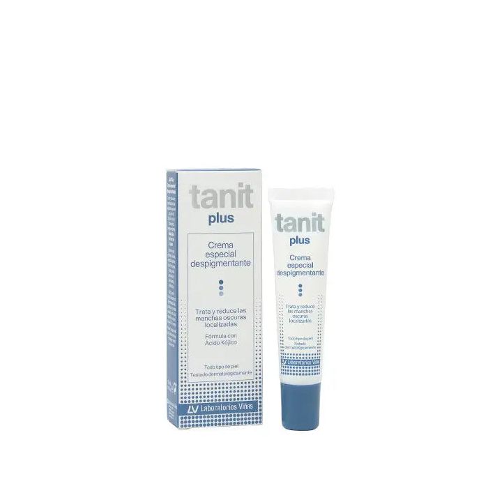 Crema despigmentante Tanit Plus, diseñada para tratar manchas en la piel.
