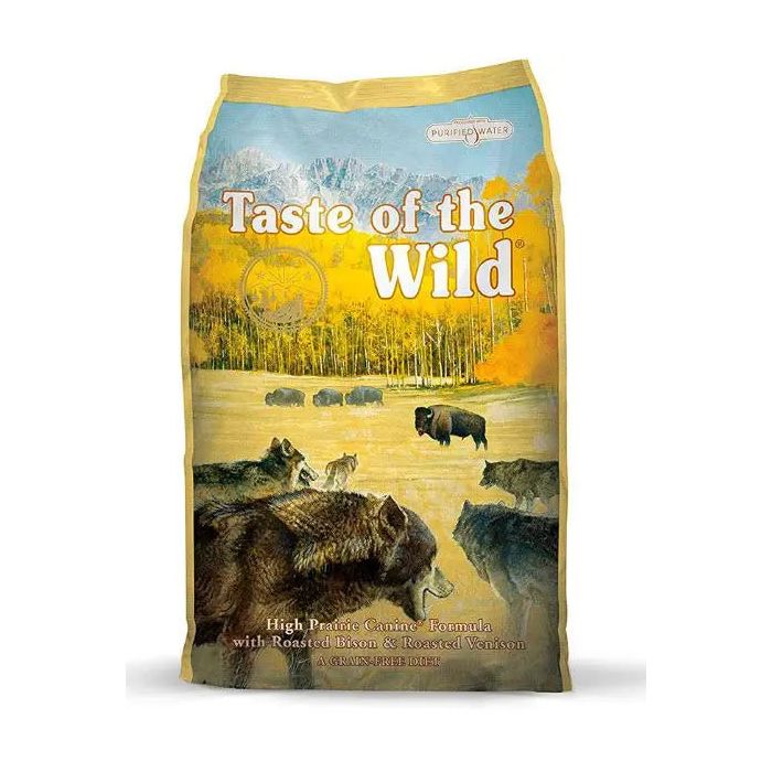 Pienso para perros Taste of the Wild High Prairie Canine con Bisonte y Venado Taste of the Wild High Prairie Canine con Bisonte y venado es un pienso para perros de calidad suprema ideal para aportar una dieta diaria sana y equilibrada a tu mascota, independientemente de su raza o edad. Se trata de una comida natural para perros de un sabor irresistible proporcionado por la carne de bisonte y de venado, que además aportan la cantidad de proteínas y grasas que tu amigo necesita. Este pienso para perros ha sido elaborado sin cereales ni gluten, impidiendo así la aparición de enfermedades derivadas de las alergias y las intolerancias alimenticias. Importantes nutrientes que sí están presentes en esta excelente comida para perros son los que aportan las frutas, verduras y hortalizas. Su aporte de vitaminas A, C y E fortalecen las defensas naturales y la salud celular del organismo de tu mascota. De su composición frutal, haremos especial hincapié en los frutos rojos como arándanos y frambuesas, encargados de ofrecer los antioxidantes necesarios para combatir agentes externos y los radicales libres, favoreciendo así al antienvejecimiento celular de tu animal. Además, el estado general de tu perro será el de un animal fuerte y sano y rebosante de energía gracias a los minerales presentes (zinc, selenio, hierro y calcio) en este alimento para perros. Los hidratos de carbono provenientes de hortalizas como la patata o la batata contribuirán a llenarlo de dosis de energía. El tomate presente en Taste of the Wild High Prairie Canine con Bisonte y Venado además de beneficiar los procesos digestivos de tu mascota por su contenido en fibras. Por otro lado, los antioxidantes propios del tomate, betacarotenos y licopeno, fortalecerán la salud de tu perro. Igualmente,el extracto de yuca y la raíz de achicoria deshidratada son unas excelentes fuentes de fibra que tu mascota encontrará en este pienso en beneficio de su tránsito intestinal y tracto digestivo. Esta comida natural para perros es totalmente limpia y sana gracias a que el agua utilizada en su composición atraviesa un proceso osmótico que la libera de microorganismos o productos químicos, convirtiendo en ligeras y sanas las digestiones de tu mascota. Las dosis de proteínas y aminoácidos son equilibradas en este alimento para perros, lo que proporciona un buen estado de salud al organismo de tu animal. Por su parte, los minerales quelados, hacen que tu mascota pueda absorber de una forma más rápida y eficaz todos los nutrientes imprescindibles para su salud. Por últimos, Taste of the Wild High Prairie Canine con Bisonte y Venado completa los niveles nutricionales establecidos por la Asociación Americana Oficial del Control de Calidad de Alimentos (AAFCO). VENTAJAS: Pienso para perros con venado asado y bisonte como fuentes moderadas de proteínas y grasas. Apto para perros alérgicos o intolerantes, ya que está libre de cereales y gluten. Beneficios en la digestión por el aporte de fibras y proteínas. Gran aporte de energía por los hidratos de carbono de la batata y la patata. Agua purificada en su elaboración libre de productos químicos y microorganismos. USO Y ESPECIFICACIONES: Pienso natural para la alimentación perros de cualquier raza o edad con venado y bisonte que aportan dosis equilibradas de proteínas y grasas para tu animal.Taste of the Wild High Prairie Canine con Bisonte y venado es una deliciosa y sabrosa comida que hará que tu perro disfrute a diario y rebose de vitalidad.