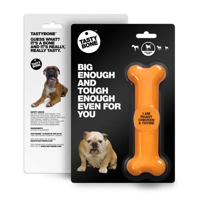 Un hueso masticable grande con sabor a pollo asado y tomillo. Este juguete