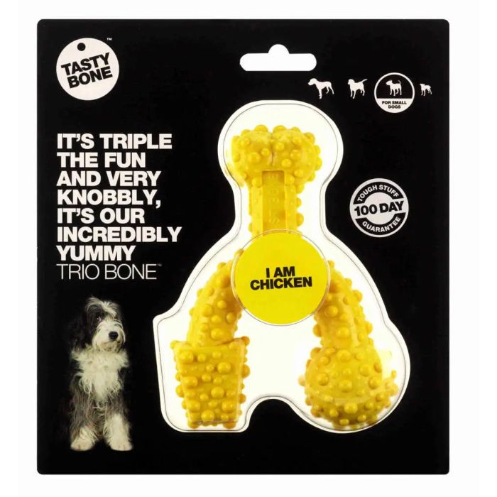 Un conjunto de tres huesos masticables pequeños con auténtico sabor a pollo.
