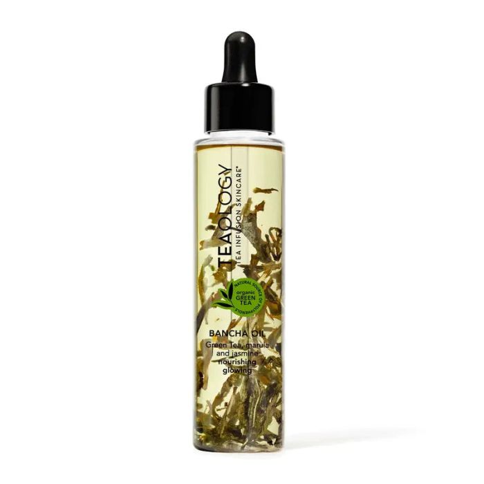 Teaology Bancha Oil contiene una mezcla de aceites botánicos infundidos con auténticas hojas de Té Verde Bancha Orgánico, utilizadas después del prensado en frío para resaltar sus propiedades hidratantes. Además, el extracto de aceite de Té Verde orgánico está lleno de polifenoles antioxidantes y vitamina E que posee un efecto anti-edad y fotoprotector. A su vez, el aceite de marula contiene una concentración de vitamina C ocho veces superior a la de los cítricos, dejando la piel con un aspecto fresco y radiante.