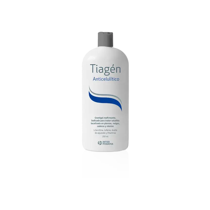 Tiagen Anticelulítica. Indicaciones: Este preparado en forma de crema-gel, está indicado para tratar la celulitis en sus diferentes niveles, reduciendo las zonas adiposas. Su aplicación regular, por su acción liporeductora y lipolítica, ayuda a eliminar los nódulos, que se localizan en el tejido conjuntivo dérmico de las piernas, nalgas, caderas, vientre, etc. Composición: L- Carnitina; Flavonoides; Cafeína; Vitaminas: E y B5; Ruscogenina; Extensina Yodada; Aceite de Aguacate.
