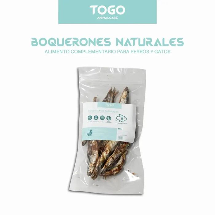 Nuestros snacks naturales de boquerones deshidratados son el regalo perfecto para tu perro o gato. Hechos con boquerones frescos y sin aditivos ni conservantes artificiales, estos snacks saludables y sabrosos proporcionan una fuente natural de nutrientes esenciales. Perfectos para premiar el buen comportamiento o simplemente para consentir a tu fiel amigo de cuatro patas.Propiedades y Beneficios:100% Naturales: Nuestros boquerones deshidratados son completamente naturales, sin aditivos, conservantes ni colorantes artificiales. Solo puro pescado deshidratado para garantizar un snack saludable y seguro para tu perro.Altos en Omega-3: Los boquerones son ricos en ácidos grasos Omega-3, que ayudan a mantener la piel y el pelaje de tu perro en óptimas condiciones, además de contribuir a la salud del corazón y del cerebro.Proteína de Alta Calidad: Estos snacks proporcionan una excelente fuente de proteína de alta calidad, esencial para el crecimiento y mantenimiento de los músculos y tejidos de tu mascota.Bajos en Calorías: Son una opción perfecta para perros que necesitan mantener un peso saludable, ya que son bajos en calorías pero ricos en sabor.Fáciles de Digerir Ideales para perros con estómagos sensibles o con alergias alimentarias. La deshidratación natural preserva los nutrientes y hace que sean fáciles de masticar y digerir.Mejora la Salud Dental: La textura crujiente de los boquerones deshidratados ayuda a limpiar los dientes y encías de tu perro, reduciendo la acumulación de placa y el mal aliento.Instrucciones de Uso:Ofrece los boquerones deshidratados como un premio ocasional o como un complemento a la dieta regular de tu perro y/o gato. Asegúrate de proporcionar siempre agua fresca y limpia. Supervisa a tu mascota mientras consume cualquier snack para evitar posibles atragantamientos.Composición AnalíticaProteína: 47%Grasa Bruta: 44.9%Fibra: 1.5%Humedad: 3.5%Ceniza: 1.9%Valor Energético: 2,493 KJ