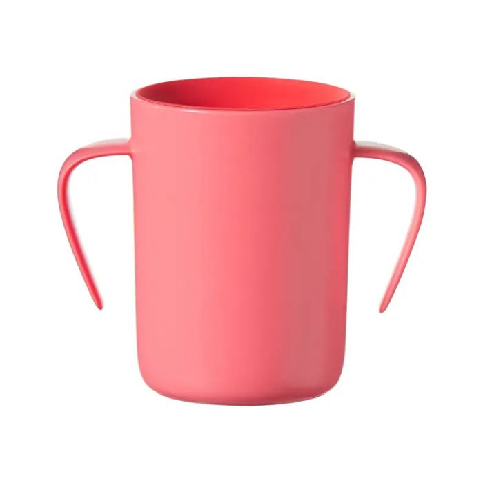como un vaso normal, con la ventaja de que impide los derrames. Incorpora asas.