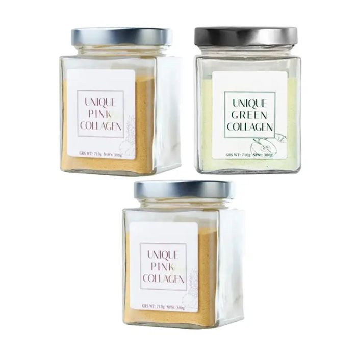 Unique Pink Yellow Collagen, 300 grPéptidos de Colágeno, Azúcar Natural de Mosto, Bisglicinato de magnesio, Sulfato sódico de Condroitina, Inulina, Extracto de Camu Camu (Myrciaria dubia - fruto) (Vitamina C), Polvo de Piña (Ananas sativa), Péptidos de Queratina, Mix de Extractos de Plantas (Mezcla Propia) (Murraya koenigii, Terminalia bellerica, Glycyrrhiza glabra, Momordica charantia, Piper nigrum, Piper longum, Cyperus rotundus, Asparagus racemosus, Alpinia galanga, Terminalia chebula, Centella asiatica, Curcuma longa, Andrographis paniculata, Zingiber officinale), Membrana de Cáscara de Huevo, Extracto de Boswellia (Boswellia serrata - Oleo resina gomosa), Edulcorante: Glicósidos de Esteviol, Extracto de Curcuma (Curcuma longa - rizoma) (Curcuminoides), Ácido Hialurónico, Astaxantina Natural (Haematococcus pluvialis), Acidulante: Ácido Cítrico; Acetato de DL-alfa-tocoferilo, Extracto de Bambú (Bambusa vulgaris - tallo) (Silicio), Levadura enriquecida con Selenio, Bisglicinato de Zinc, Metilsulfonilmetano, Menaquinona (Vitamina K2-MK7), Ubiquinol (Q10), D-Pantotenato de Calcio (Vitamina B5), Maltodextrina, Hidrocloruro de Piridoxina (Vitamina B6), Colecalciferol (Vitamina D3), Ácido Pteroilglutámico (Folato - Vitamina B9), Biotina (Vitamina H), Aromas de Piña y Fruta de la Pasión, Colorante Rojo de Boniato de origen naturalUnique Green Collagen Suplemento Nutricional, 300 gramosColágeno, Azúcar Natural de Mosto, Extracto de Espinaca (Spinacia oleracea L.), Colina L-Bitartrato, Acidulante: Ácido Cítrico, Inulina, Extracto de Cardo mariano (Silybum marianum), Extracto de Diente de león (Taraxacum officinale), Extracto Té verde (Camellia sinesis), Glutatión, Extracto de Cola de Caballo (Equisetum arvense L.), Extracto de Schisandra (Schisandra chinensis), Mix de Extractos de Plantas (Tinospora cordifolia, Hemidesmus indicus, Piper longum Linn, Alpinia galangal, Terminalia chebula Retz, Swertia chirata Buch, Murraya koeniggii, Curcuma longa and Zingiber officinale), Edulcorante: Glicósidos de Esteviol, Polvo de Piña (Ananas sativa), Piridoxina Hidrocloruro (Vitamina B6), Tiamina Hidrocloruro (Vitamina B1), Biotina (Vitamina H), Aromas de Manzana y Té, Colorantes de origen natural.