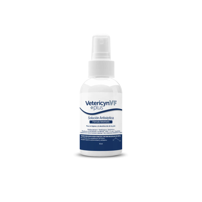 Vetericyn Plus VF Solución Antiséptica está especialmente formulada para limpiar, irrigar, humedecer y desbridar heridas de todo tipo.Disponible en tres formatos de 500 ml, 120 ml y 55 ml.Fórmula no tóxica ni irritanteEspecies de destino: Gatos, perros, equino, ovinoVetericyn Plus VF tiene actividad antipruriginosa junto con acción antimicrobianaLa fórmula en aerosol permite una fácil aplicación y se puede usar para aumentar la presión durante el desbridamiento mecánicoTres tamaños para su uso en clínica y en pacientesNo deja residuosSeguro tanto si es lamido como ingeridoSin antibióticos ni corticoesteroides: seguro para su uso en animales con enfermedades sistémicas, como diabetesIndicaciones:Preparación del lecho de la heridaLimpieza e irrigaciónHeridas agudas y crónicasCortes y abrasionesQuemaduras, llagas, úlcerasAvulsionesIrritaciones dérmicas y mucosasHeridas en las extremidades inferiores, almohadillas y áreas interdigitalesInjertosAplicaciones postquirúrgicasReducción del dolor y el olorCaracterísticas:Fórmula no tóxica ni irritanteVetericyn Plus VF no es citotóxico, no irrita, no genera sensibilización y no tiene toxicidad oral. Puede ser usado con seguridad en todos los tejidos dérmicos sin dañar los fibroblastos.Sin contraindicaciones con otros fármacos o tratamientosVetericyn Plus VF es un producto seguro, no se han descrito contraindicaciones con fármacos o tratamientos.Solución estable con larga vida útilVetericyn Plus VF está disponible en 3 tamaños (500 ml, 120 ml y 55 ml) para facilitar su uso tanto en la clínica como en el hogar. Los productos tienen una vida útil promedio de 24 meses gracias al exclusivo proceso de fabricación que optimiza los niveles de HOCl y pH.