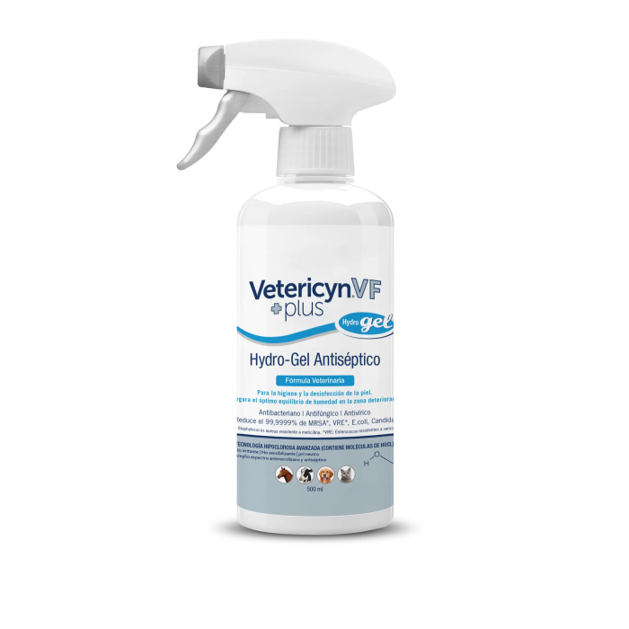 Vetericyn Plus® VF Hydro-Gel Antiséptico es una solución viscosa pulverizable especialmente formulada para humedecer y desbridar todo tipo de heridas.Disponible en tres formatos de 500 ml, 120 ml y 55 ml.Fórmula no tóxica ni irritanteVetericyn Plus® VF tiene actividad antipruriginosa junto con acción antimicrobianaLa fórmula en aerosol permite una fácil aplicación y se adhiere a la superficie, minimizando así la incomodidad para el animalTres tamaños para su uso en clínica y en pacientesEl gel pulverizable humedece y suaviza el tejido para facilitar la preparación del lecho de la heridaSin antibióticos ni corticoesteroides: seguro para su uso en animales con enfermedades sistémicas, como diabetes